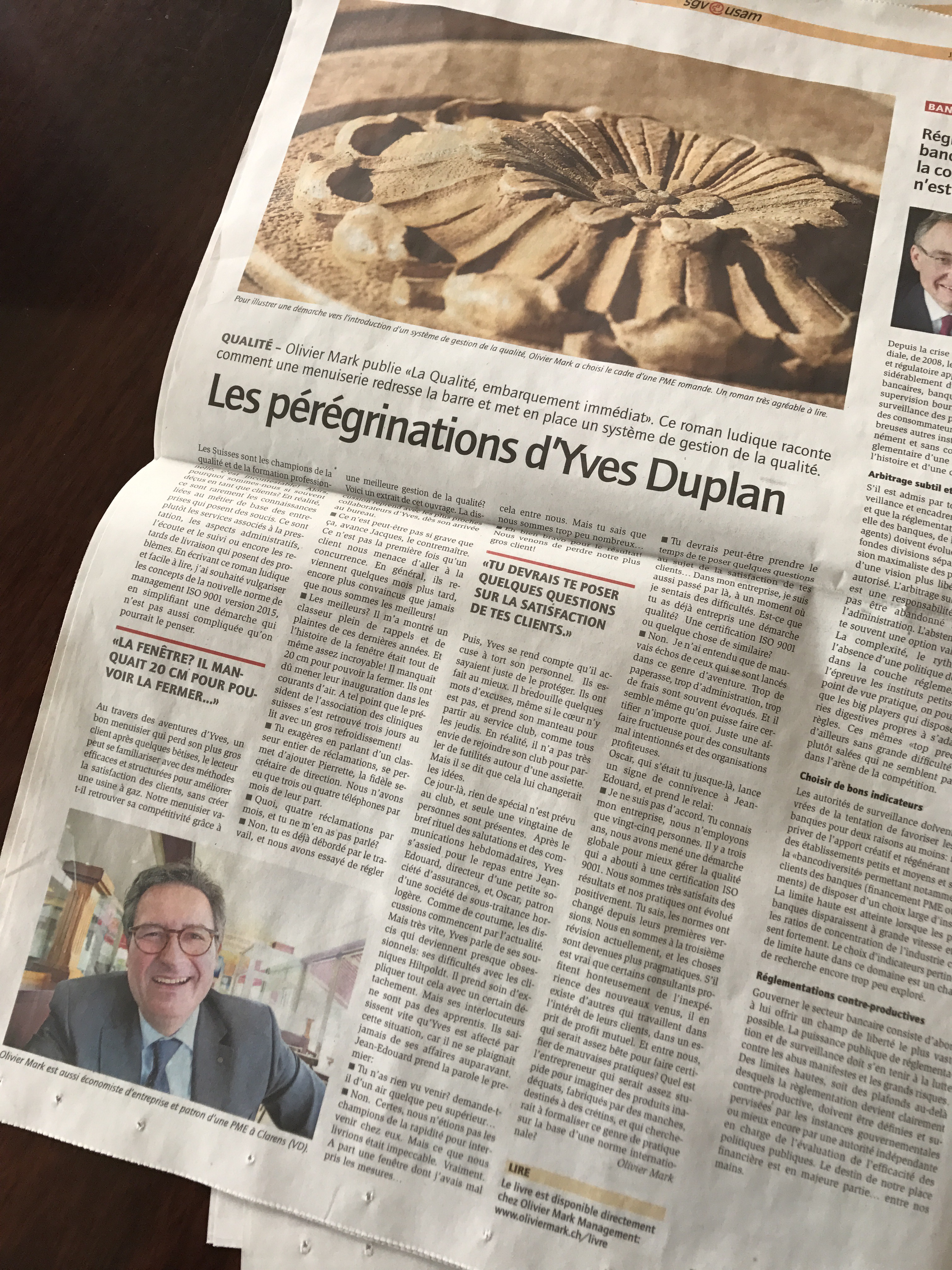 Quelle belle surprise de voir Yves Duplan, le patron fictif du roman didactique « La qualité, embarquement immédiat ! », faire les titres du Journal des Arts et Métiers de janvier !